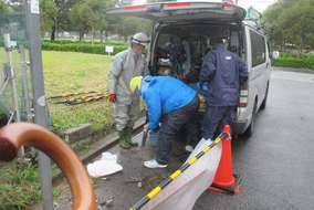 既設の防犯灯ポールが、車庫の車の出し入れの際邪魔になるとのことでポールの移設と、 移設に伴い引き込み線の引込方向も変更してほしいとの依頼を受けました。 高所作業車を使用し、3名での作業です。