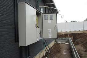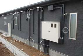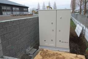 (敷地内にハンドホール、基礎ブロックを施設し、東電が「集合住宅用 変圧器」を設置して供給する方式)で 電気変圧器を設置しました。